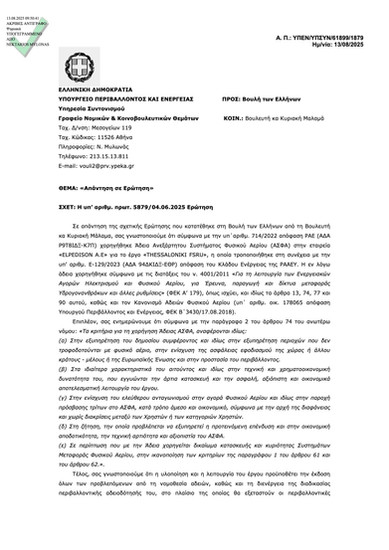 Σε συνέχεια την κοινοβουλευτικής ερώτησης της Κυριακής Μάλαμα για το θέμα της εγκατάστασης μονάδας υγροποιημένου φυσικού αερίου εντός του Θερμαϊκού Κόλπου, το Υπουργείο Περιβάλλοντος κι Ενέργειας απέστειλε την απάντηση του στη Βουλή στις 13 Αυγούστου 2025.
