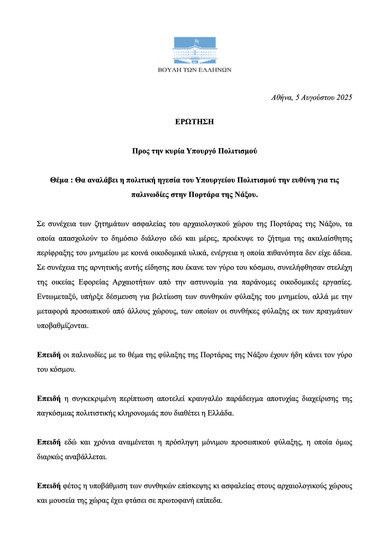 Κατεπείγουσα κοινοβουλευτική ερώτηση προς την Υπουργό Πολιτισμού κατέθεσε η Κυριακή Μάλαμα σε σχέση με το πολύ σοβαρό ζήτημα που έχει προκύψει με την φύλαξη του αρχαιολογικού χώρου της Πορτάρας της Νάξου. Όπως επισημαίνεται στην ερώτηση, σε συνέχεια των ζητημάτων ασφαλείας του αρχαιολογικού χώρου της Πορτάρας της Νάξου, τα οποία απασχολούν το δημόσιο διάλογο εδώ και μέρες, προέκυψε το ζήτημα της ακαλαίσθητης περίφραξης του μνημείου με κοινά οικοδομικά υλικά, ενέργεια η οποία πιθανότητα δεν είχε άδεια. Σε συνέχεια της αρνητικής αυτής είδησης που έκανε τον γύρο του κόσμου, συνελήφθησαν στελέχη της οικείας Εφορείας Αρχαιοτήτων από την αστυνομία για παράνομες οικοδομικές εργασίες. Εντωμεταξύ, υπήρξε δέσμευση για βελτίωση των συνθηκών φύλαξης του μνημείου, αλλά με την μεταφορά προσωπικού από άλλους χώρους, των οποίων οι συνθήκες φύλαξης εκ των πραγμάτων υποβαθμίζονται.
