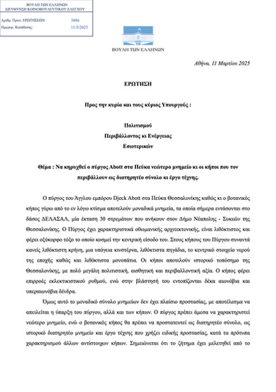 Κ. Μάλαμα : Να κηρυχθεί ο πύργος Abott στα Πεύκα Θεσσαλονίκης νεώτερο μνημείο κι οι κήποι που τον περιβάλλουν ως διατηρητέο σύνολο κι έργο τέχνης.