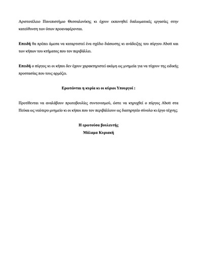 Θέμα : Να κηρυχθεί ο πύργος Abott στα Πεύκα νεώτερο μνημείο κι οι κήποι που τον περιβάλλουν ως διατηρητέο σύνολο κι έργο τέχνης.